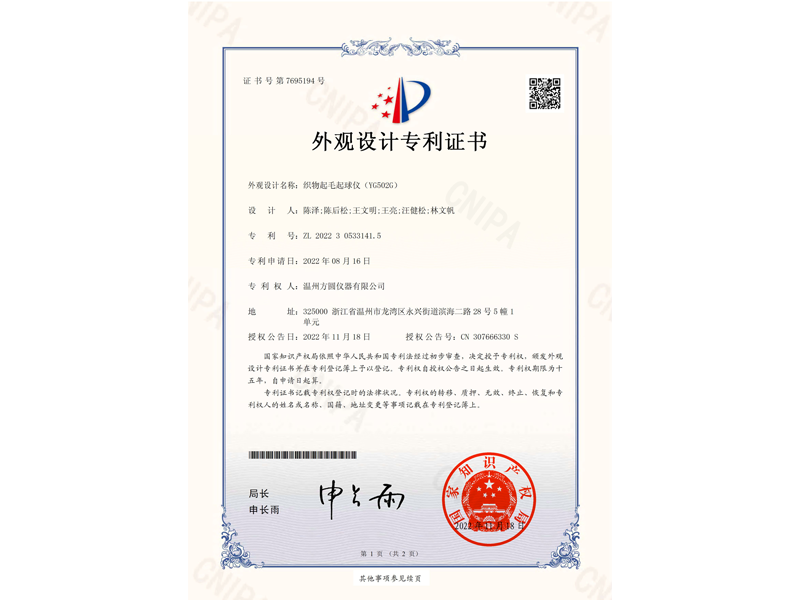 中國外觀設計專利:織物起毛起球儀(ZL 2022 3 0533141.5)