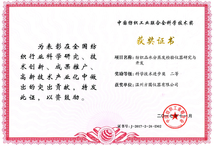 溫州方圓儀器榮獲二項“紡織之光”2017年度科學技術進步獎二等獎