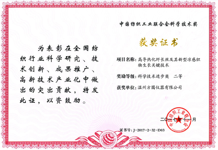 近日,在由中國紡織工業(yè)聯(lián)合會主辦、紡織之光科技教育基金會協(xié)辦的“紡織之光”2017年度中國紡織工業(yè)聯(lián)合會科技教育獎勵大會上,溫州方圓儀器有限公司參評的“紡織品水分蒸發(fā)檢驗儀器研究與開發(fā)”、“高導熱化纖長絲及其新型涼感織物生產關鍵技術”雙雙榮獲“科學技術進步獎二等獎”。