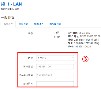2.修改網(wǎng)橋的管理IP地址:網(wǎng)絡(luò),接口,點(diǎn)擊修改,基本配置里可以進(jìn)行操作,點(diǎn)擊“保存&應(yīng)用”;